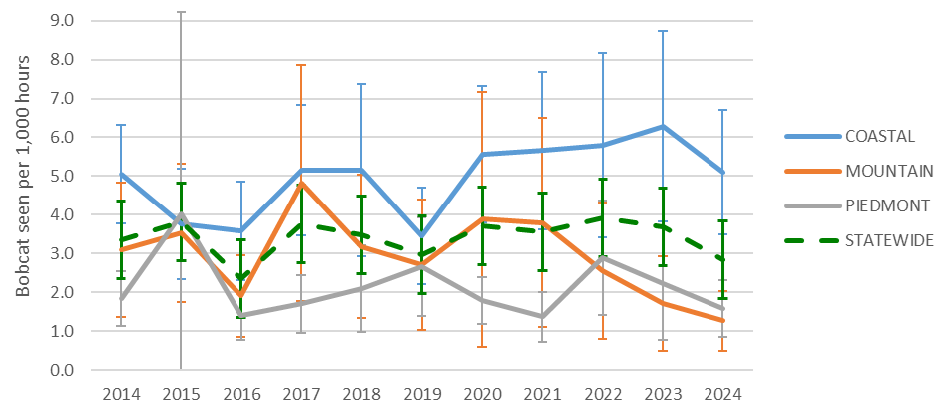 Bobcat numbers may have varied over the past 11 years, but there is no evidence that statewide bobcat observation rates have significantly increased or decreased over that period (Figure 6). Regional annual estimates were relatively imprecise generally due to the scarcity of observations, ranging from 2.0 - 5.7 bobcats per 1,000 hours.