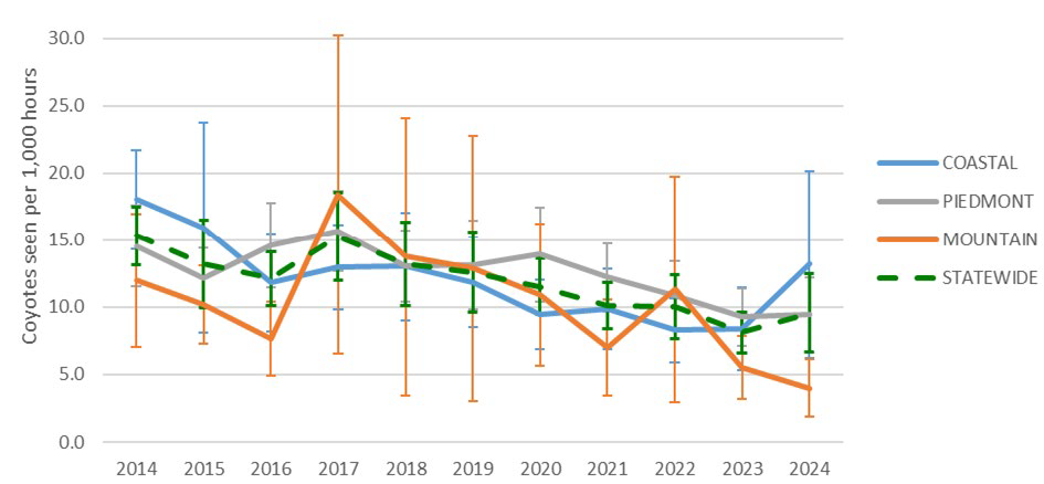 There is evidence that observation rates for coyotes have decreased across the Coastal, Piedmont, and Mountain management units over the past 11 years (Figure 5). Spatial results match that of other indices the NCWRC uses to track coyote population distributions which indicate that populations are fully distributed across the state.