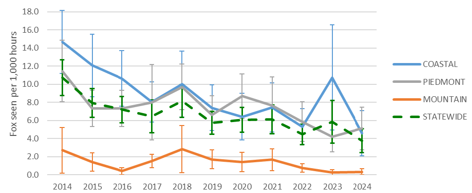 During the past 11 years, there was significant evidence that gray fox observation rates have declined statewide (Figure 7). Observations were relatively rare compared to other game and furbearer species (5.3 fox per 1,000 hours). Observation rates of gray foxes were significantly lower in the Mountain FMU than the Coastal and Piedmont regions (-5.7 gray foxes per 1,000 hours).